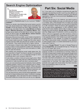 ![]() Rhode Island Search Engine OptimizationSearch Engine Optimization For Wire And Cable Sites By Paul Streicker, Streicker & Company Inc. Do you need a Facebook page for your business? Twitter? LinkedIn? Before you decide, stop thinking that social media is just for your kids. Social media is hot. Twitter carries more traffic than Google. All the big brands are there. Many politicians, old and young, have been there, from John McCain and Harry Reid to Michele Bachmann and Anthony Weiner. Also, at least seven editors of the Wall Street Journal, have been there as well as stars like Demi Moore, Ashton Kutcher and thousands of NFL football players. Because of the enormous traffic, social media is important to Google. If information is shared between your website and your social media accounts, Google and the other search engines spot the traffic and assume the content to be fresh and relevant. They reward the site with a higher ranking. For that reason, it doesn't really matter if the engineer you are trying to reach is using Facebook to select wire. Because of its higher ranking, he will find your site more easily no matter how he uses the internet. But creating and maintaining social media takes time. Do you have time to Tweet? You have to decide if it is important enough to make time, or if it is important enough to have somebody else in your company make time. It also takes a creative mind and some tough armor. What can you possibly say today that won't offend someone, bore someone or make yourself look silly to someone else? If you can overcome those personal obstacles, there is still the targeting question. Some of your customers are on Twitter, others on Facebook and others on LinkedIn. Others may want email updates from your website. Others may be browsing YouTube. In order to reach all these different customers, you would want to be in all these places, but oh the time! You can save time by using a social media aggregator, a paid service for disseminating social media. Compose a message on an aggregator, and it will send the same message to all the social media you include when you set up your aggregator. If you want a lot of analytics concerning who gets the message and what they do with it, and if you can afford it, try Nimble or HubSpot, two relatively expensive and efficient aggregators. If you are more economical, HootSuite can do the basic job, too. Your post can be long. If, for instance, you want to post a 1000-word news release and a jpg, you obviously can't post it on Twitter, with a 140-character limit. To make your social media work smoothly and quickly, you may want to subscribe to a URL shortener. These are built-in with aggregators or can be used without aggregators. A URL shortener either posts the full news release, where it fits or posts a link to it. Google has a free shortener, Goo.gl/. Bitly and TinyURL are also free. Owly is part of HootSuite, to which you subscribe. With or without an aggregator and URL shortener, is there a link from your website to your Twitter feed, and is there one in the opposite direction, from Twitter to your site? If you post a news release on your website, is it posted on Facebook, too? When using social media, remember to pay attention to other people's posts, so content detrimental to your business doesn't stay up. Are you on Google Places? You get on Google Places by joining Google Plus. Go to Google and sign up. The sign-up box is in the upper right corner. One social media vehicle that requires some up-front work and expense, but little or no maintenance is YouTube. Videos on YouTube increase search engine rank because Google owns YouTube and trusts itself to provide reliable backlinks from this high-traffic, highly ranked site. When someone plays a YouTube video that is embedded on your site, Google smiles. Find someone who knows about both creating videos and posting them on YouTube. You might want both a video producer and a geek who knows about YouTube channels, titles and embedding video on your site. Paul Streicker Paul Streicker is president of Streicker & Company Inc., a business-to-business marketing communications agency that emphasizes website development and advertising, both internet and print, for manufacturers and manufacturing service industries. Streicker & Company represents a number of manufacturers serving the wire and cable industry. This is the sixth in a series of articles being published bi-mothly in Wire & Cable Technology. Part one is here. Part two is here. Part three is here. Part four is here. Part five is here. |